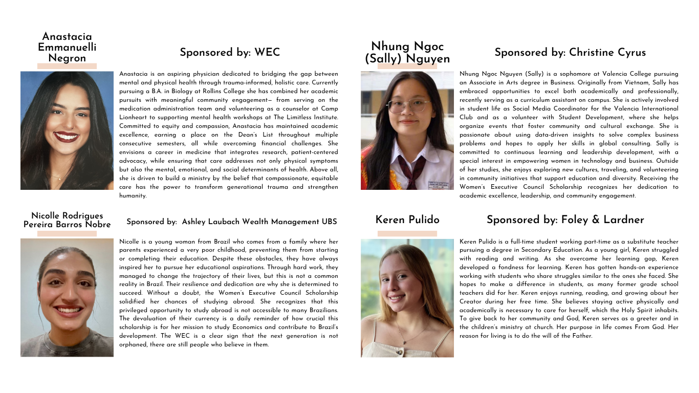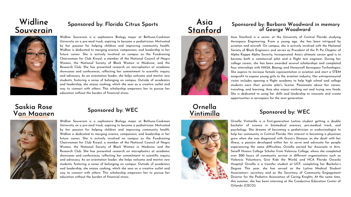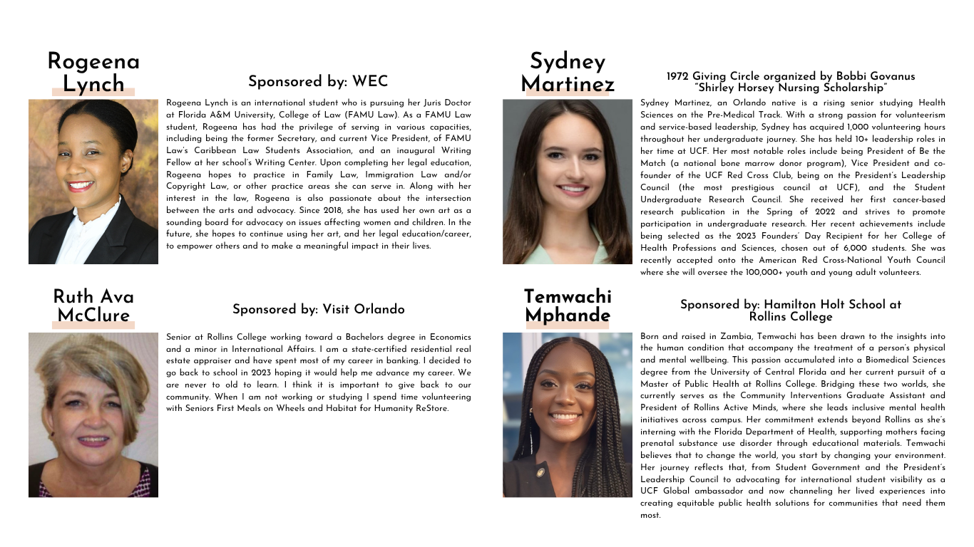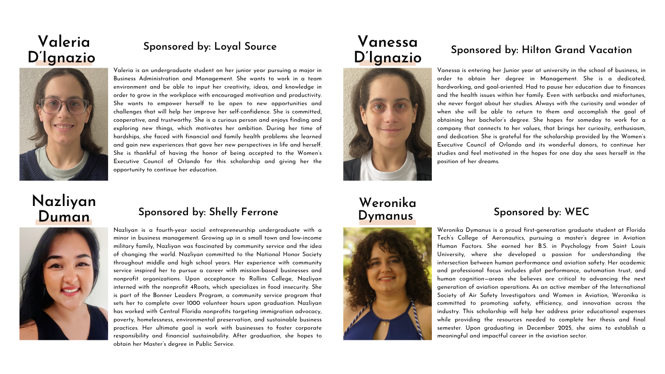 Since 1987 the Women's Executive Council has been awarding scholarships ranging from $500 - $1972 to women attending Barry University Dwayne O. Andreas School of Law, Daytona State College, Florida A&M University (FAMU) College of Law (Orlando), Florida Institute of Technology (Orlando), Herzing University (Orlando), Rollins College (College of Liberal Arts), Rollins College (Crummer Graduate School of Business), Rollins College (Hamilton Holt School), Seminole State College, University of Central Florida and Valencia College.