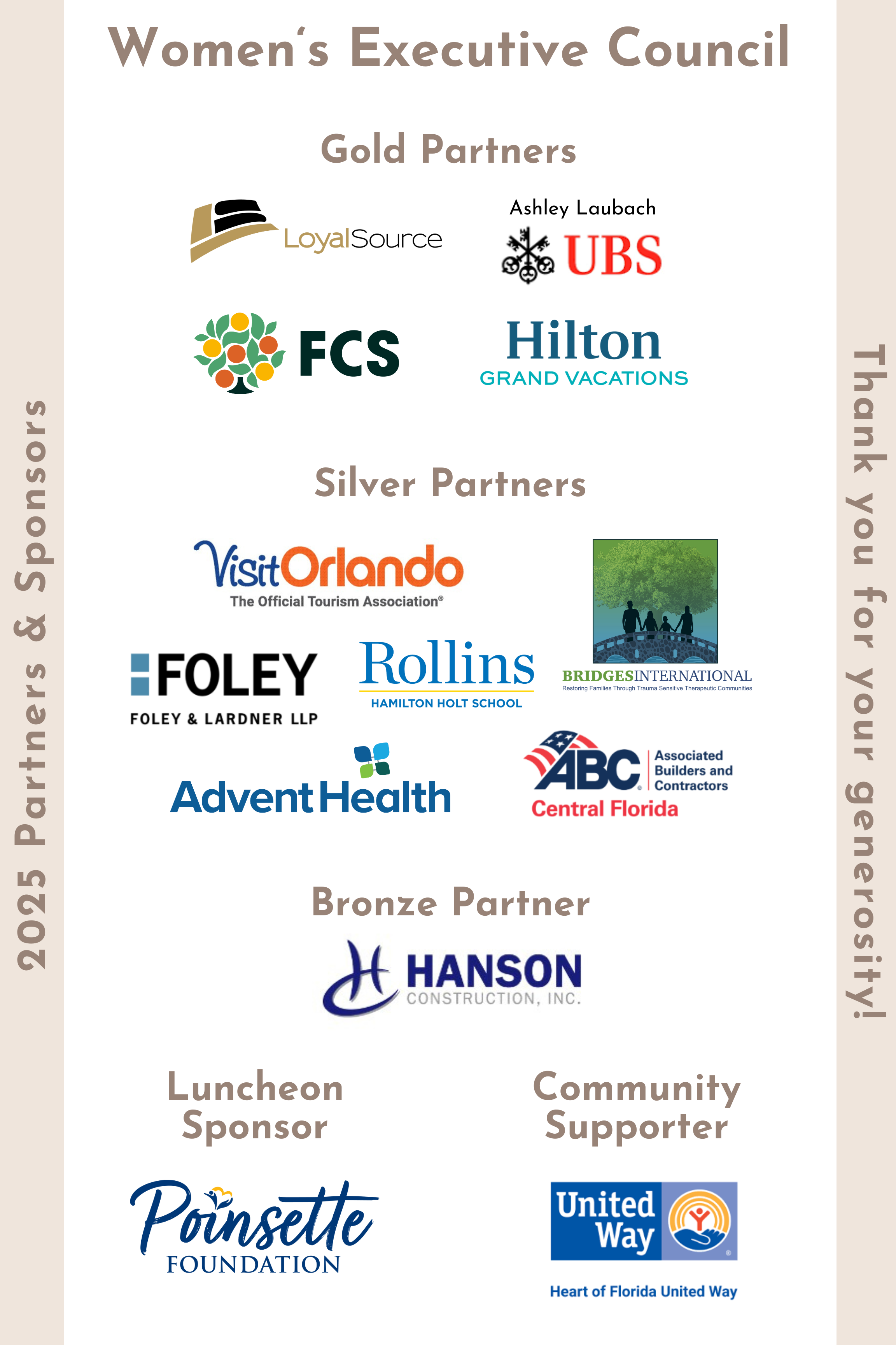 All proceeds and direct donations fund college scholarships to Central Florida women through the 501(c)(3) Women's Executive Scholarship & Endowment Fund, Inc.